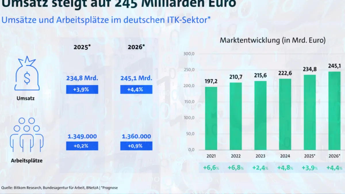 Der Branchenverband Bitkom schaut optimistisch in das Jahr 2026. Denn während viele Branchen mit schwacher Nachfrage ringen, zeigt sich die Digitalwirtschaft robust. Der Markt für Informationstechnik und Telekommunikation (ITK) wird voraussichtlich im Jahr 2026 um 4,4 Prozent auf 245,1 Milliarden Euro wachsen, vor allem angetrieben von Software und digitalen Infrastrukturen. „In Zeiten anhaltender Konjunkturschwäche, hoher Kosten und geopolitischer Spannungen zeigt sich die Digitalwirtschaft widerstandsfähig. Das aktuelle Wachstum in Markt und Beschäftigung ließe sich verdoppeln, würden die Rahmenbedingungen stimmen. 2026 muss zum Jahr des Durchbruchs in der Digitalpolitik werden“, sagt Bitkom-Präsident Dr. Ralf Wintergerst. „Wir müssen weg von Überregulierung und Bürokratie, hin zu schnellen Genehmigungen, praxistauglichen Regeln und einer echten digitalen Verwaltung, die den Bürgerinnen und Bürgern sowie den Unternehmen dient, statt ihnen Nerven und Ressourcen zu rauben. Wer Digitalisierung will, muss sie möglich machen, bei Netzen und Rechenzentren ebenso wie bei Plattformen, künstlicher Intelligenz oder in der Datenwirtschaft.“